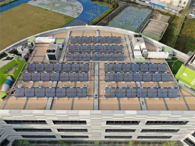 ——室外運動場雨棚屋面由太陽能光伏發(fā)電板組成,既能夠發(fā)電也能夠遮風(fēng)擋雨。部分屋面也建有真空管太陽能熱水系統(tǒng),太陽能熱水可供廚房使用。