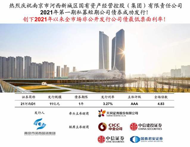 本次債券的成功發(fā)行充分體現(xiàn)了河西集團(tuán)管理層對(duì)市場(chǎng)時(shí)機(jī)的準(zhǔn)確把握和對(duì)資本市場(chǎng)運(yùn)作的成熟掌控能力,同時(shí)也顯示了投資人對(duì)河西集團(tuán)高度認(rèn)可和未來(lái)業(yè)務(wù)發(fā)展的強(qiáng)烈信心。我們將以此為基礎(chǔ),再接再礪,與各方高度配合,做好與證券商后續(xù)企業(yè)債券發(fā)行工作。