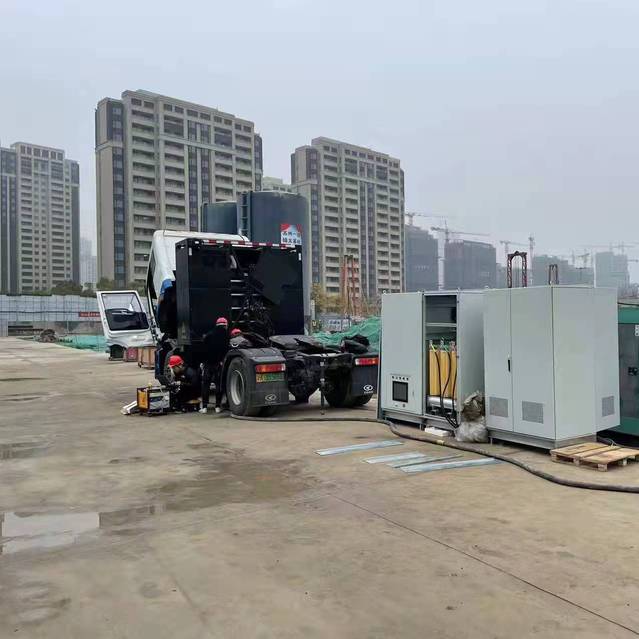 受接入的施工用電線路功率限制,現(xiàn)有配電箱無(wú)法滿足新增打樁設(shè)備用電需求。按常規(guī)做法需增設(shè)柴油發(fā)電機(jī),但此類(lèi)型發(fā)電機(jī)噪音大,排放高溫廢氣,不符合現(xiàn)代社會(huì)節(jié)能環(huán)保的大趨勢(shì)。因此,本項(xiàng)目率先引進(jìn)無(wú)噪音、無(wú)廢氣排放的鋰電移動(dòng)儲(chǔ)能動(dòng)力站與施工用電線路并網(wǎng),在施工用電低谷期間進(jìn)行電池充電,樁基施工用電高峰期間補(bǔ)充電力缺口。如接入的施工用電線路長(zhǎng)期滿載,可由儲(chǔ)能動(dòng)力站廠家運(yùn)送滿電電池進(jìn)行現(xiàn)場(chǎng)換電,將缺電電池運(yùn)回充電。