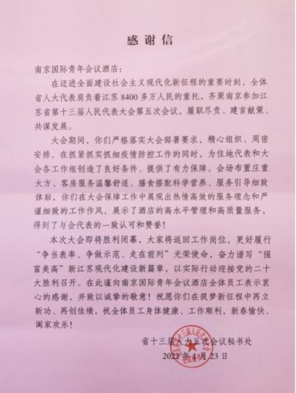 江蘇省第十三屆人民代表大會(huì)第五次會(huì)議于2022年1月20日至1月23日在南京召開。河西集團(tuán)青奧城公司國際青年會(huì)議酒店和金陵江濱酒店作為本次大會(huì)的重點(diǎn)接待單位,圓滿完成了此次接待任務(wù),獲得與會(huì)代表的一致好評。