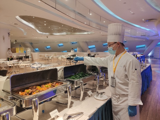 酒店為迎接大會(huì)接待任務(wù),早部署早安排,第一時(shí)間籌建大會(huì)專項(xiàng)服務(wù)組與服務(wù)大使團(tuán)隊(duì),與大會(huì)各工作組細(xì)致對接,針對會(huì)議期間的防疫要求、接待動(dòng)線、住宿安排、會(huì)議用餐等方面研究制定出“會(huì)議閉環(huán)”專項(xiàng)方案,將會(huì)議中心、酒店大堂及客房樓層劃入閉環(huán)管理。